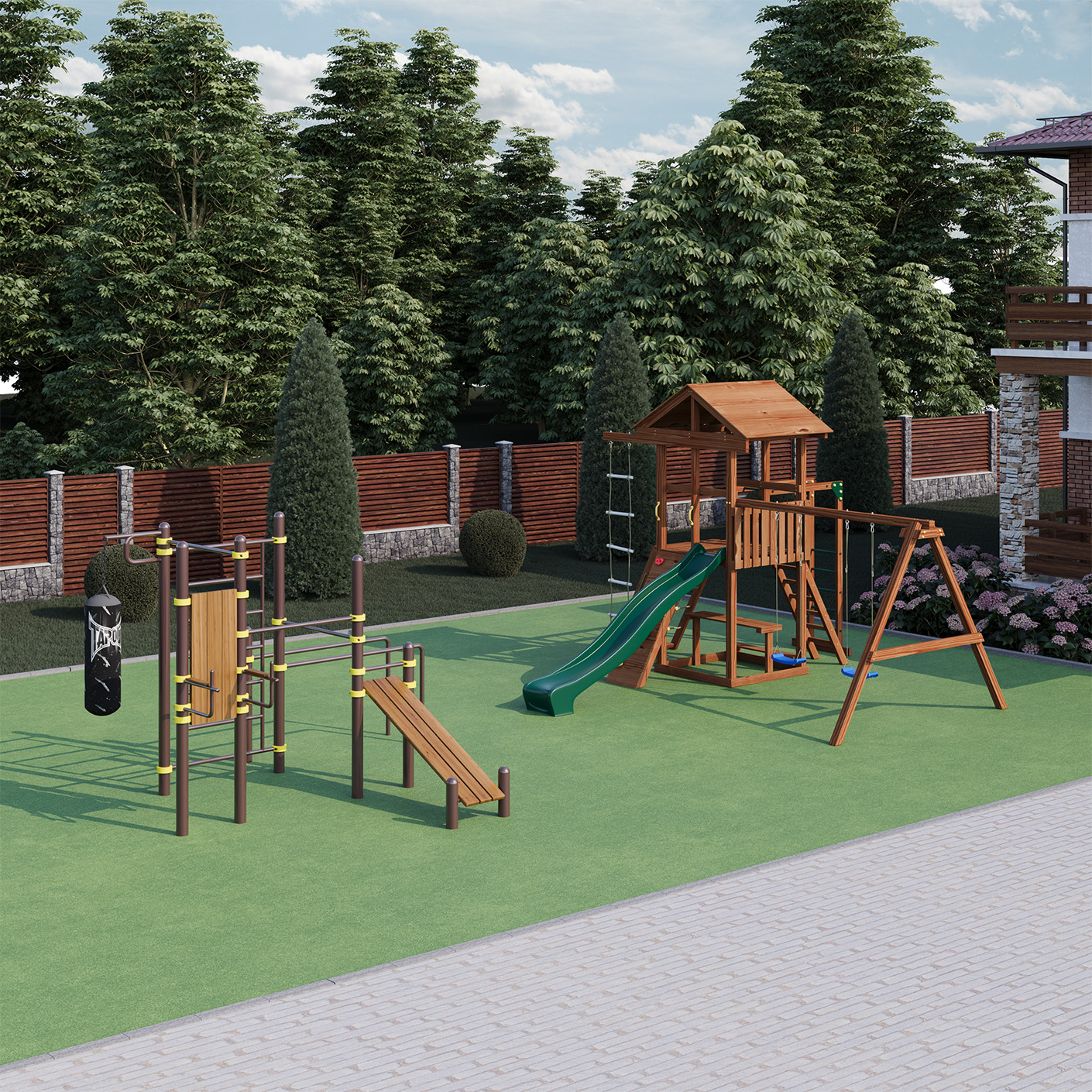 Комплекс включает: спортивно-развивающее оборудование СВС-72-М , детская площадка Family F6