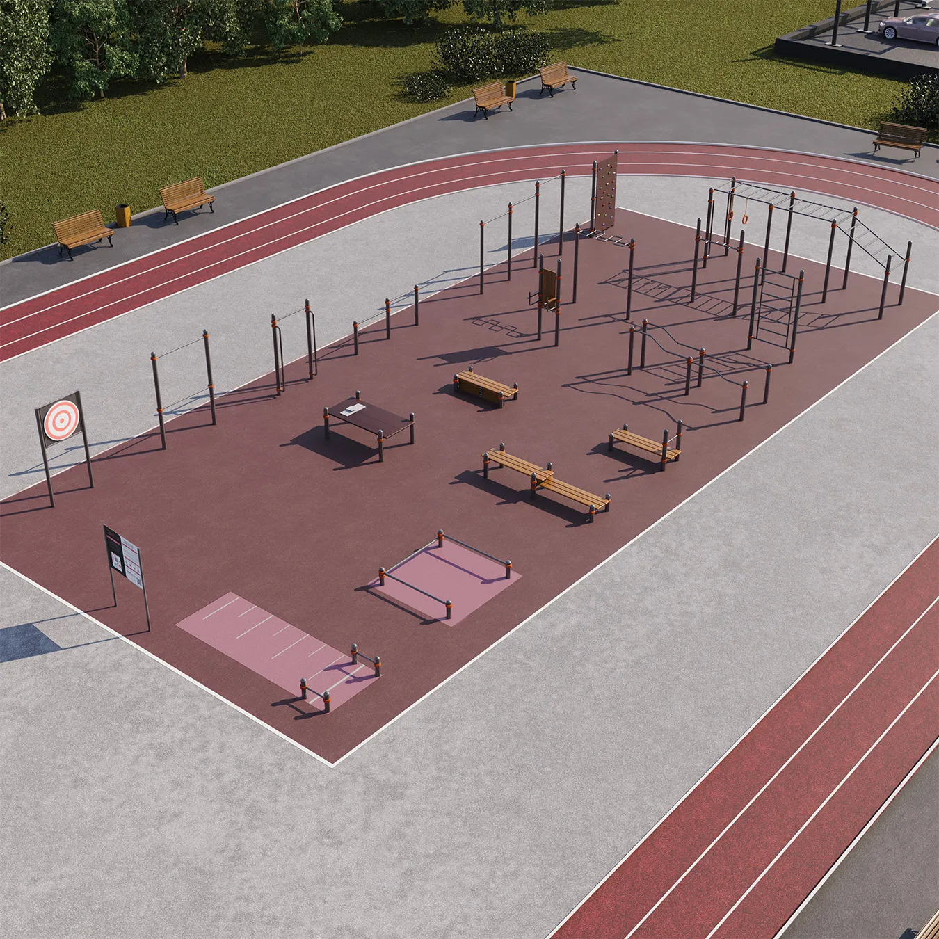 - Подвижные тренажеры (синего цвета), изображенные на макете площадки, не входят в стоимость. Данные тренажеры в нашем ассортименте не представлены.