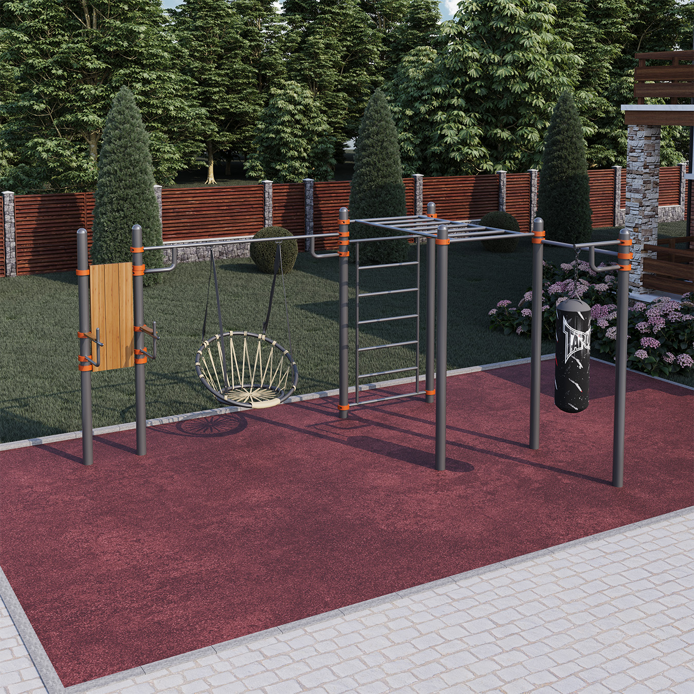 - Благодаря возможности выбора цвета, спортивный комплекс отлично вписывается в различные дизайн проекты загородных домов, дач, школ, дворовых территорий, площадок Воркаут/workout.