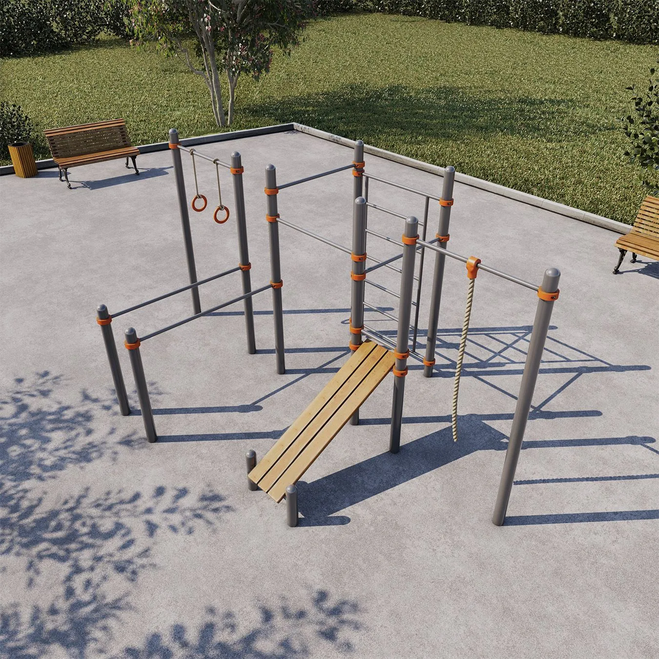 - Регулируемые по высоте перекладины, скамьи для пресса.