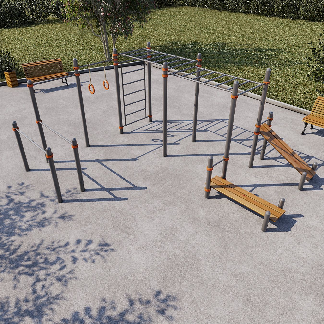 - Регулируемые по высоте перекладины, скамьи для пресса, секции рукохода.