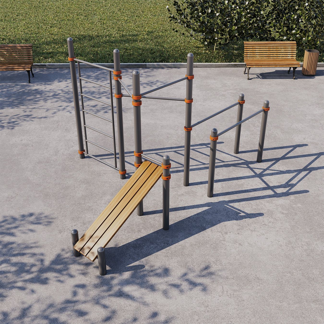 - Регулируемые по высоте перекладины, скамья для пресса.