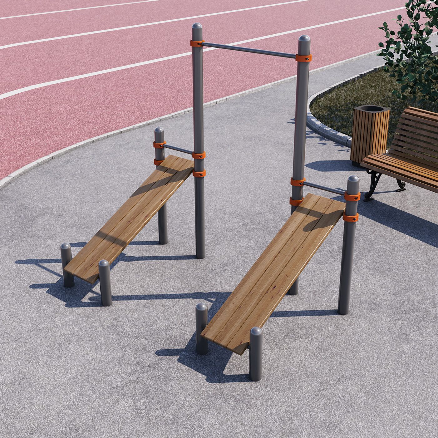 - Регулируемая по высоте перекладина, скамьи для пресса.